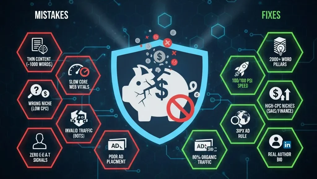 If your site feels like a generic bot-feed, advertisers won’t bid, and Google won’t rank you. Below are the 12 critical mistakes and their technical fixes.